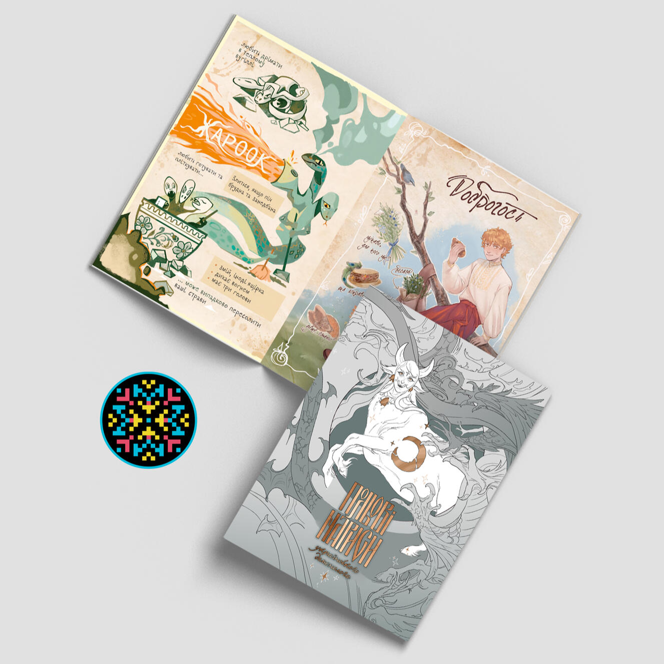 "Ukrainian Bestiary" is a book by a mysterious fictional researcher of the spirits of Ukrainian mythology, documenting encounters with these creatures. Each spread is dedicated to a creature, with several illustrations and a brief description of it. 100 Ukrainian artists took part in the creation, among whom 50 spirits were divided: two illustrators share the spread, developing the concept art of the creature and illustrations of its details and habits.The artbook examines the creatures of lower mythology (demonology). The spirits it contains could have been found not only on the territory of Ukraine, but are considered from the point of view of Ukrainian ethnography. The artbook is not an ethnographic work - some information or artistic interpretations may differ, but all descriptions are based on existing ethnographic research.